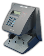 The HandPunch uses RSI's field-proven hand geometry biometric technology. The terminal captures a three-dimensional image of the hand each time the employee punches. The hand's size and the shape are used to verify their identity with unparalleled accuracy. No fingerprints or palm prints are utilized. Green and red lights notify the employee of the status of each punch. There's no question any more; employees have to be there to punch.